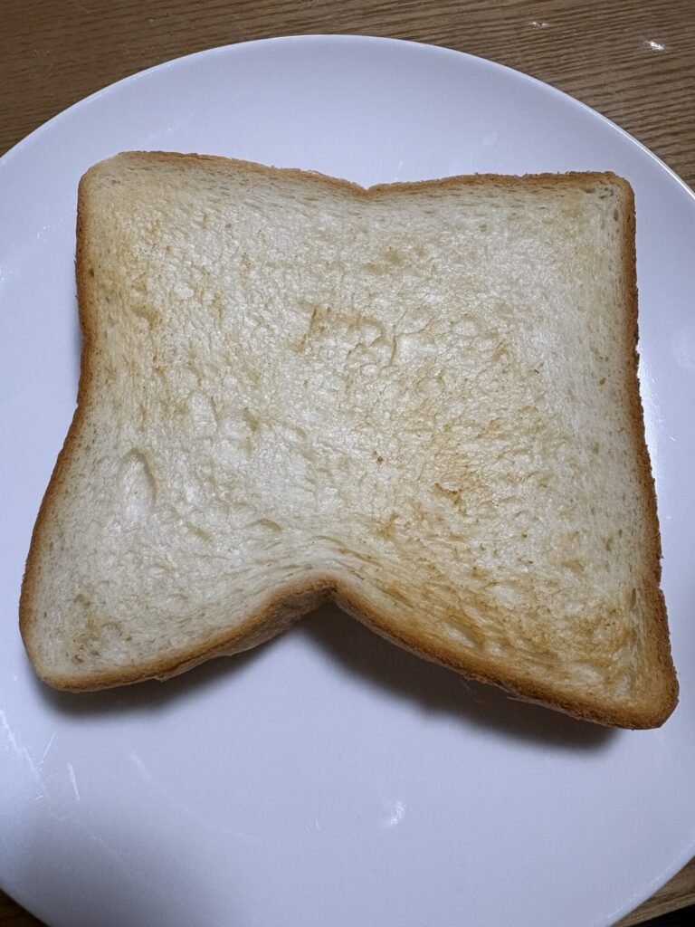以下は2枚まとめて焼いたときの食パンの写真です。焼き色は少し足りないかもしれませんが、十分サクサクしていておいしかったです。