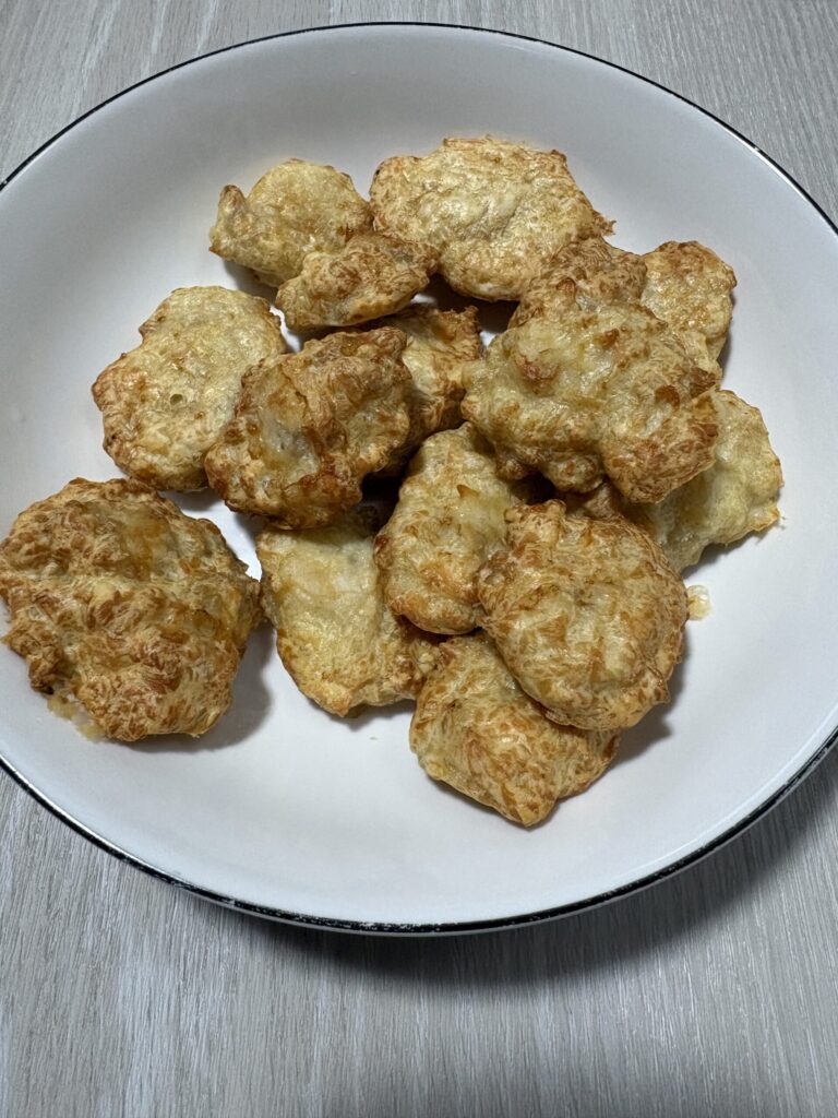 いわゆる「揚げたナゲット」のような、しっかりした焼き色はつきません。