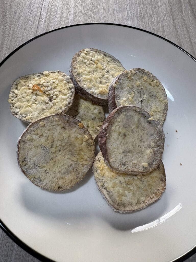 そこで色をつけようと210℃でさらに5分加熱したところ、一部がさつまいもチップスのように固くなってしまいました😢