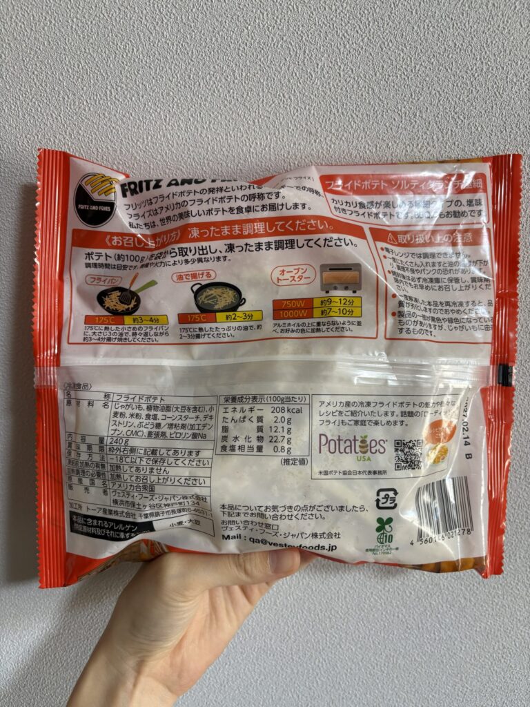 時短できる:ポテトのパッケージ裏側にオーブントースター1000W7~10分とあります。量にもよるでしょうがノンフライヤーであれば200℃6分程度で十分な仕上がりになります。