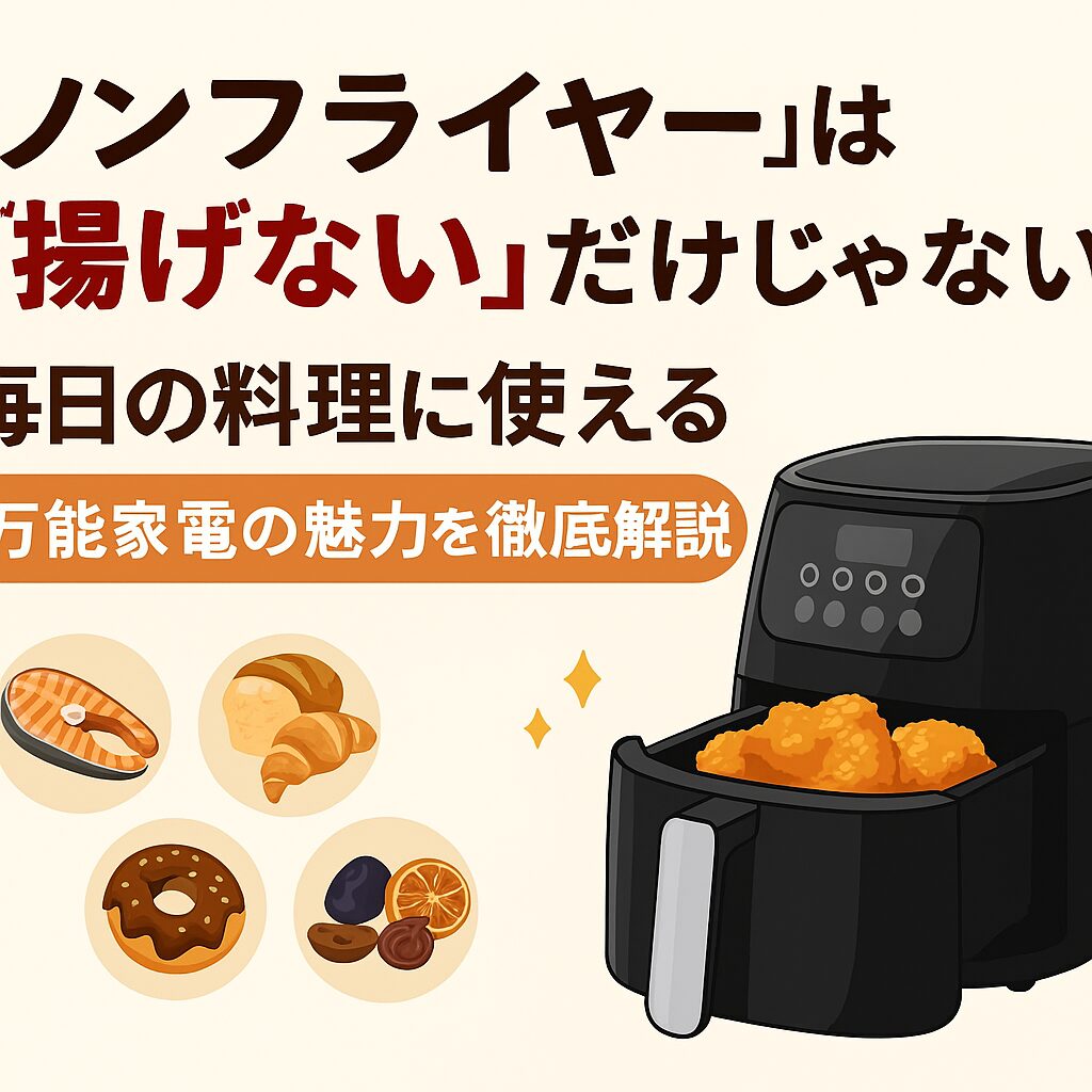 ノンフライヤー=揚げ物専用と思っていませんか?実は、焼き物・温め直し・スイーツ・ドライ調理まで幅広く使える、毎日の料理に役立つ万能家電なんです。この記事では、ノンフライヤーの基本機能から揚げ物以外の活用法、調理のコツ、ライフスタイル別のおすすめポイントまで、実体験を交えてわかりやすく解説します。購入を迷っている方も、すでに持っているけど使いこなせていない方も、ぜひ参考にしてください!