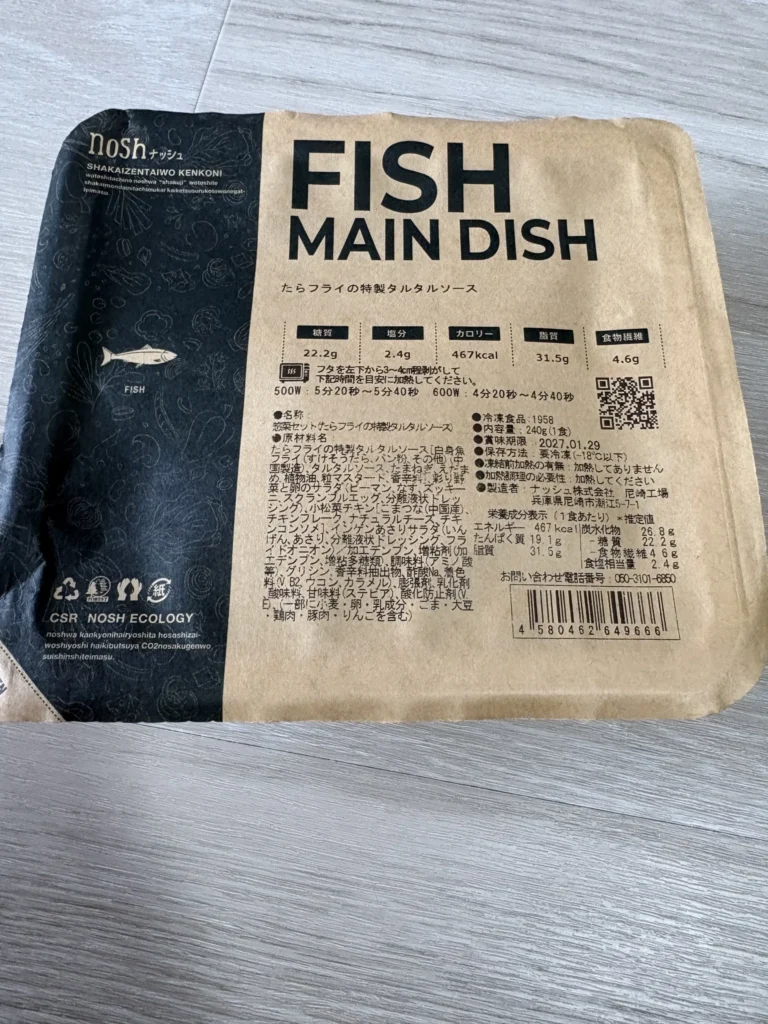 nosh(ナッシュ)の人気メニュー「たらフライの特製タルタルソース」を実際に食べてみました。糖質22.2g・467kcalという栄養成分や電子レンジ加熱時間、味の印象まで詳しくレビューします。フィレオフィッシュを思わせる味わいなのか?副菜のクオリティも含めて、個人の感想として正直にまとめました。